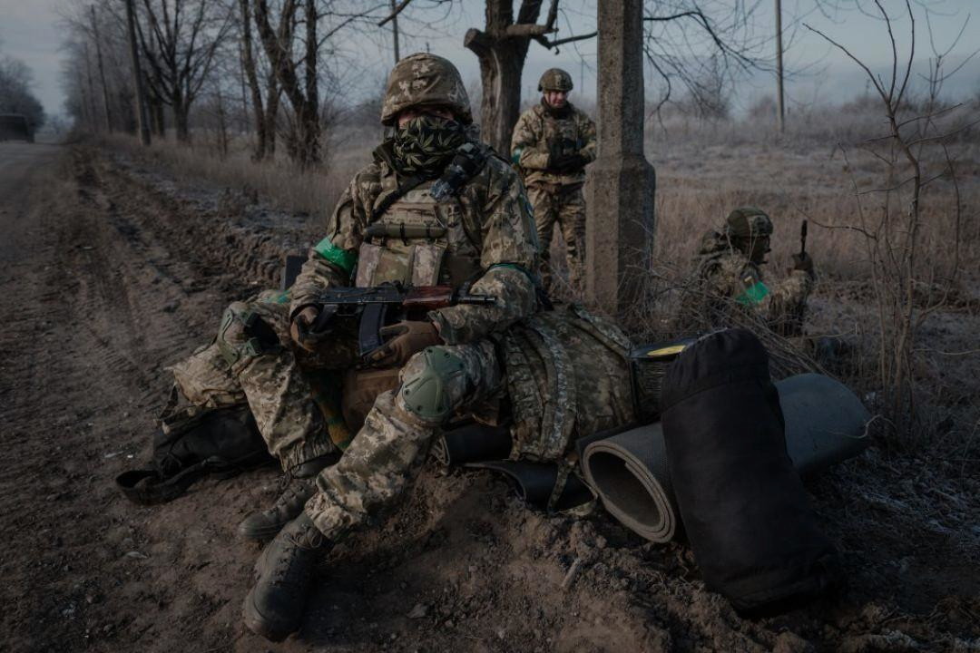 A Ukrainian serviceman of the 93rd brigade covers his ears while firing a French 120mm rifle towed mortar towards Russian positions in Bakhmut, Donetsk Oblast, on Feb. 15, 2023. (Yasuyoshi Chiba / AFP via Getty Images)