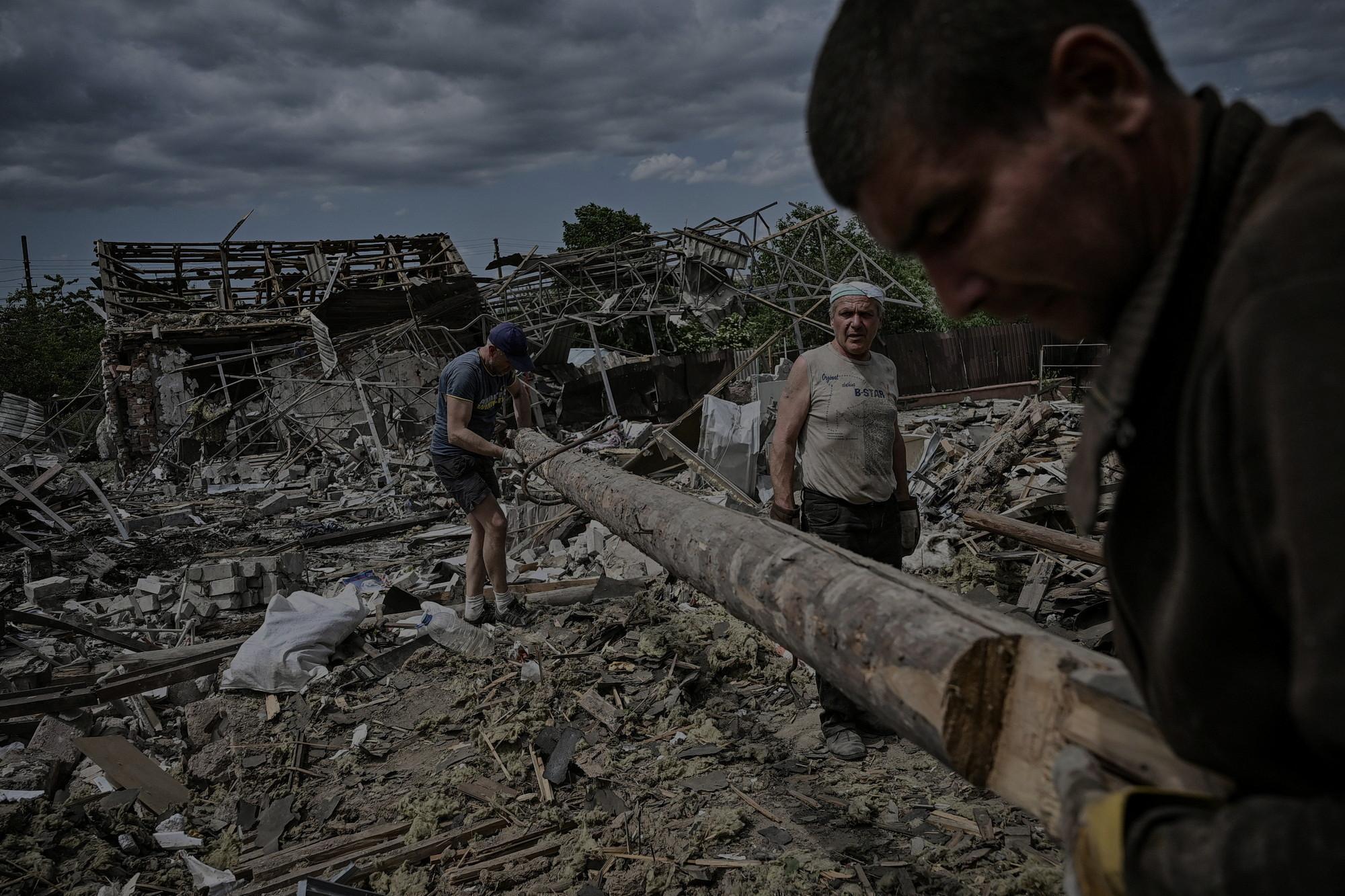 Firefighters and rescuers are seen searching for survivors on the damaged top floor of the building in Sloviansk following a rocket attack by the Russian troops. Russian troops attacked the eastern Ukrainian city of Sloviansk on Eastern Orthodox Great Friday. (Photo by Ashley Chan/SOPA Images/LightRocket via Getty Images)