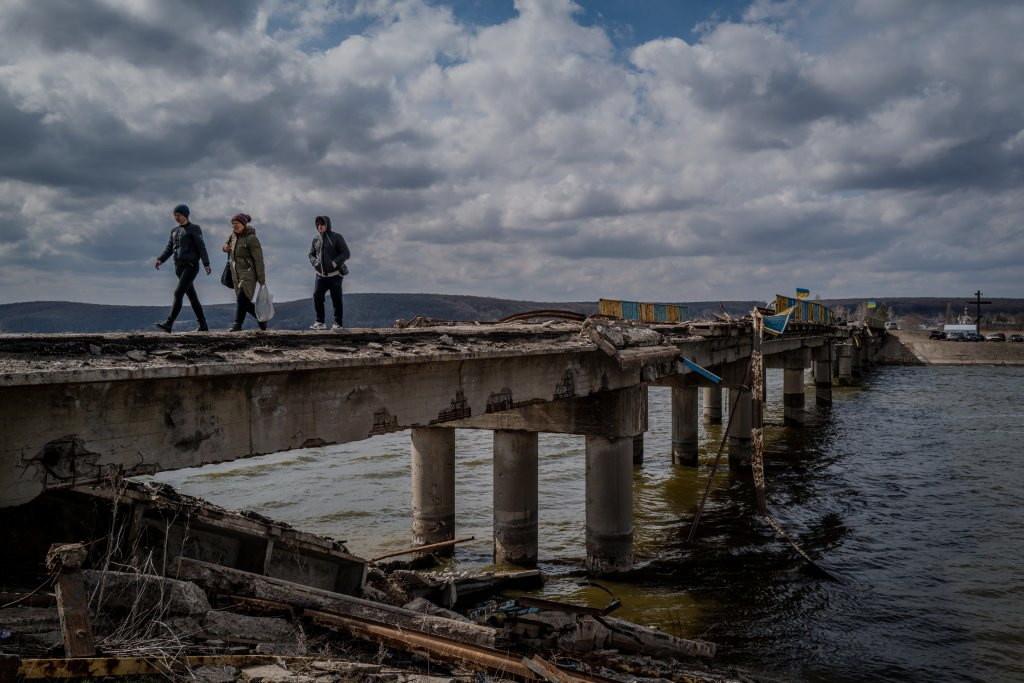 Civilians cross a damaged bridge in Staryi Saltiv, Kharkiv Oblast, Ukraine on March 28, 2023. (Photo by Wolfgang Schwan/Anadolu Agency via Getty Images)
